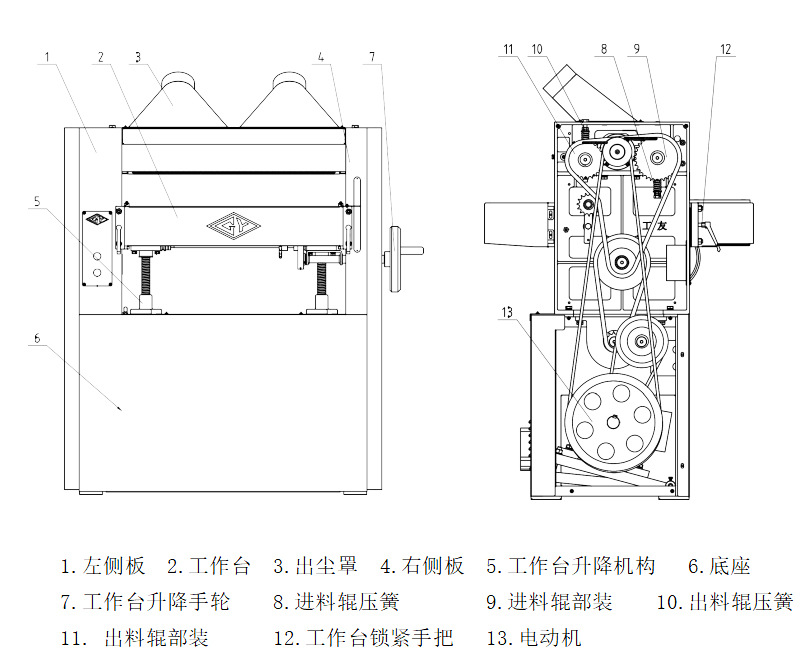 該機(jī)床送料平穩(wěn),前壓輥采用分段活動(dòng)結(jié)構(gòu),可同時(shí)送入厚度相差2毫米以內(nèi)的多塊材料;前后壓料器調(diào)節(jié)方便,可加工薄板;工作臺(tái)升降裝置結(jié)構(gòu)合理,操作平穩(wěn)輕便;獨(dú)特的主軸結(jié)構(gòu),保證良好的加工質(zhì)量。該機(jī)具有兩級(jí)送料速度,可滿足不同加工工件的要求。